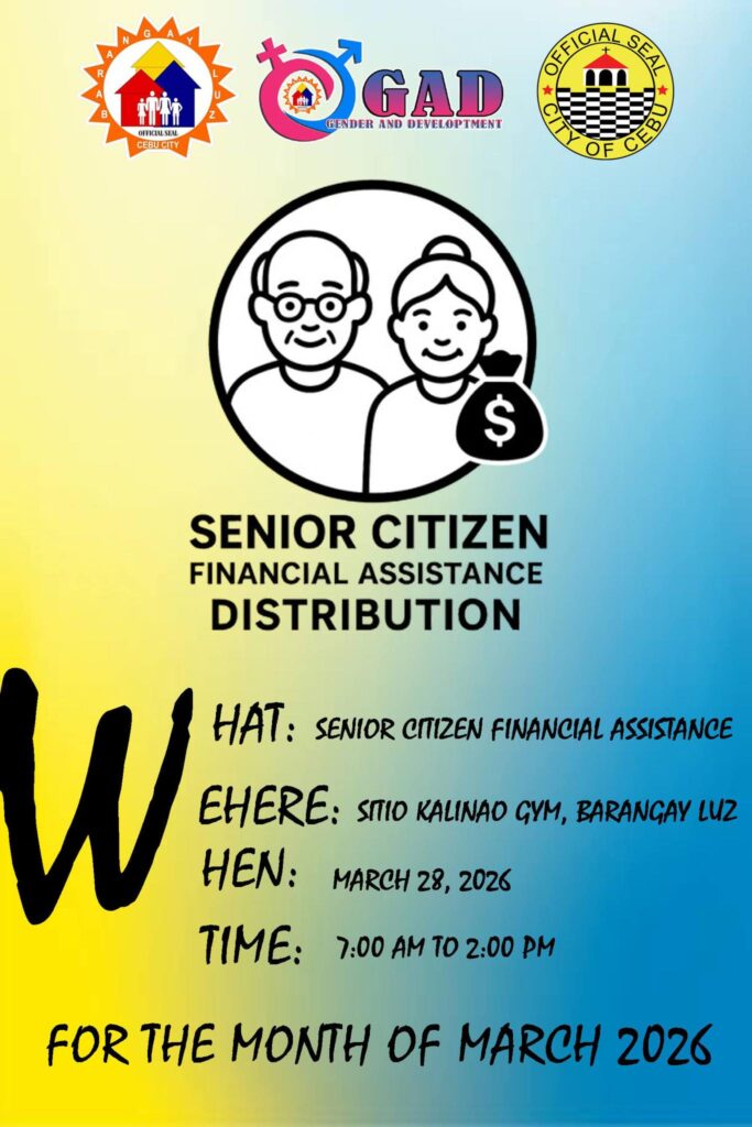 Gipahibalo ang tanang Senior Citizens sa Barangay Luz, ilabi na sa Sitio Kalinao, nga aduna kitay distribution sa financial assistance karong umaabot: