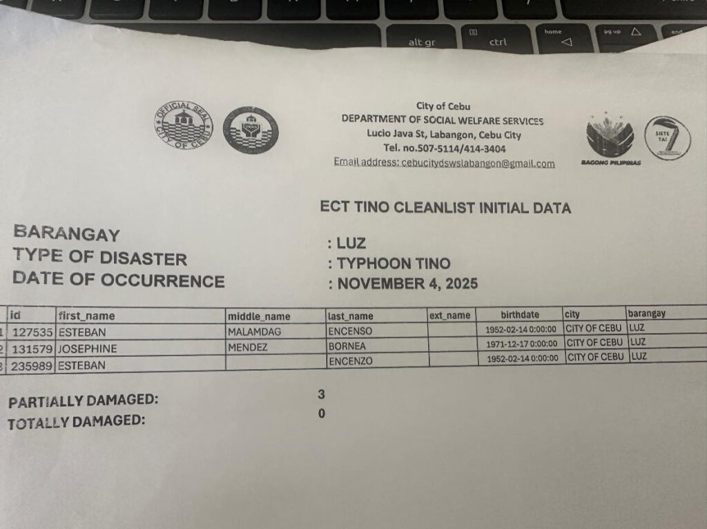 Sumala sa assessment ug evaluation nga gihimo sa DSWS, duha (2) lamang ka beneficiaries ang naapil sa opisyal nga listahan. Kini sila ang napamatud-an nga direktang naapektuhan ug kwalipikado sa maong ayuda.